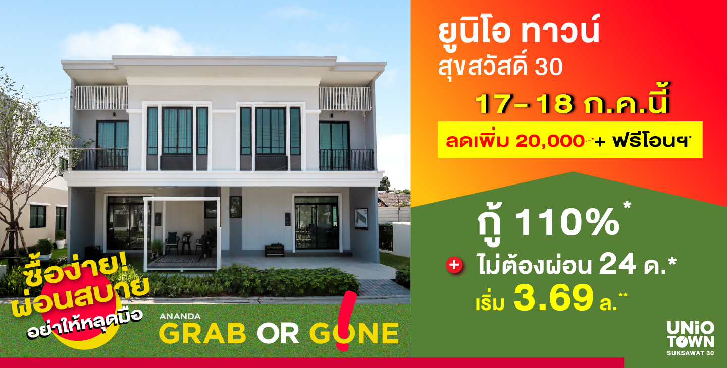 ยูนิโอ ทาวน์ สุขสวัสดิ์ 30 17-18 ก.ค.นี้ ลดเพิ่ม 20,000 บ.* / เริ่ม 3.69 ลบ.*